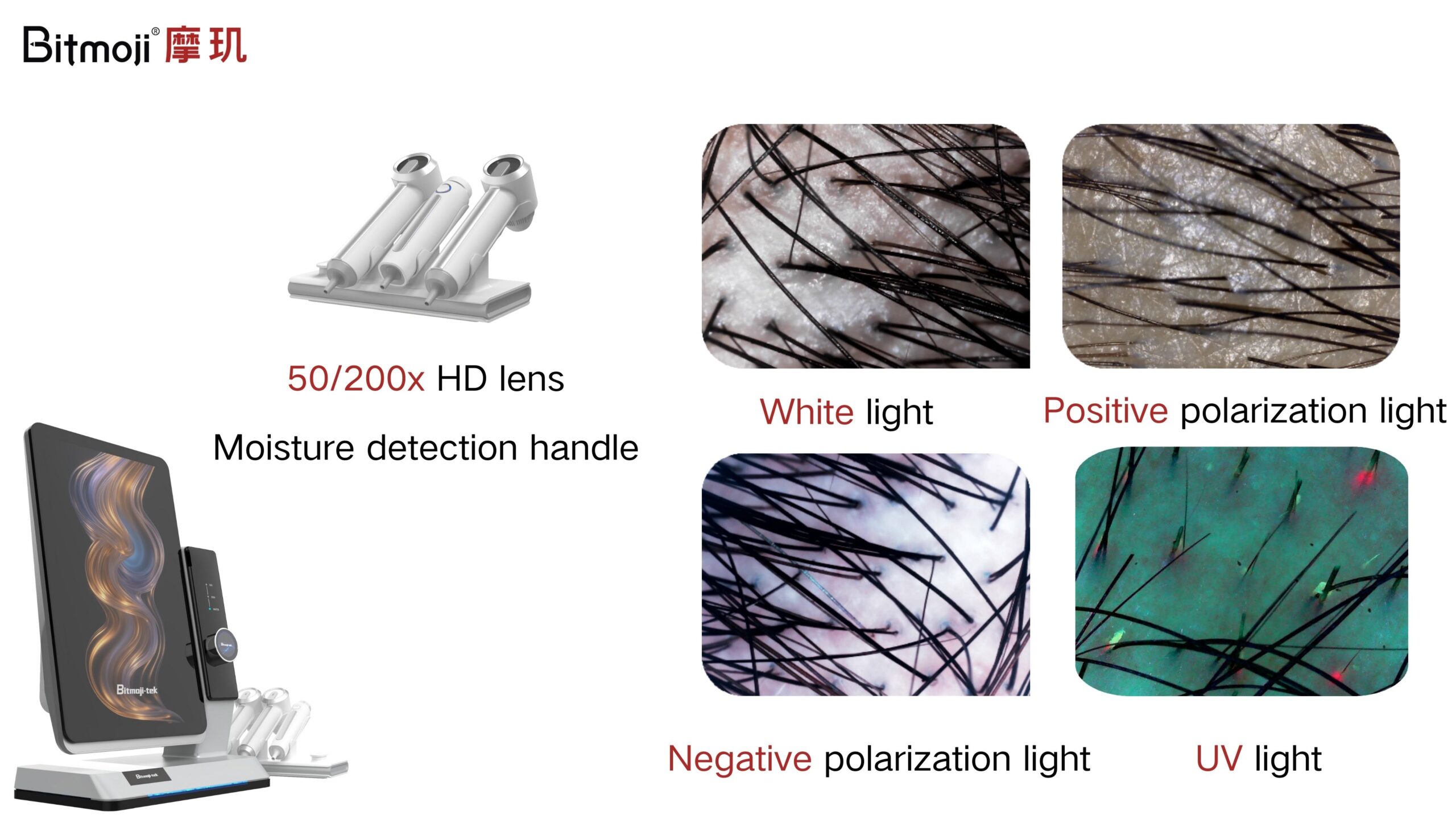 Take the Bitmoji T8 Scalp Analyzer as an example. It uses a 50/200x HD lens and four-spectrum imaging technology to scan the scalp under white light, positive polarized light, negative polarized light, and UV light. This multi-angle view captures tiny follicle details and deep scalp conditions with great clarity.