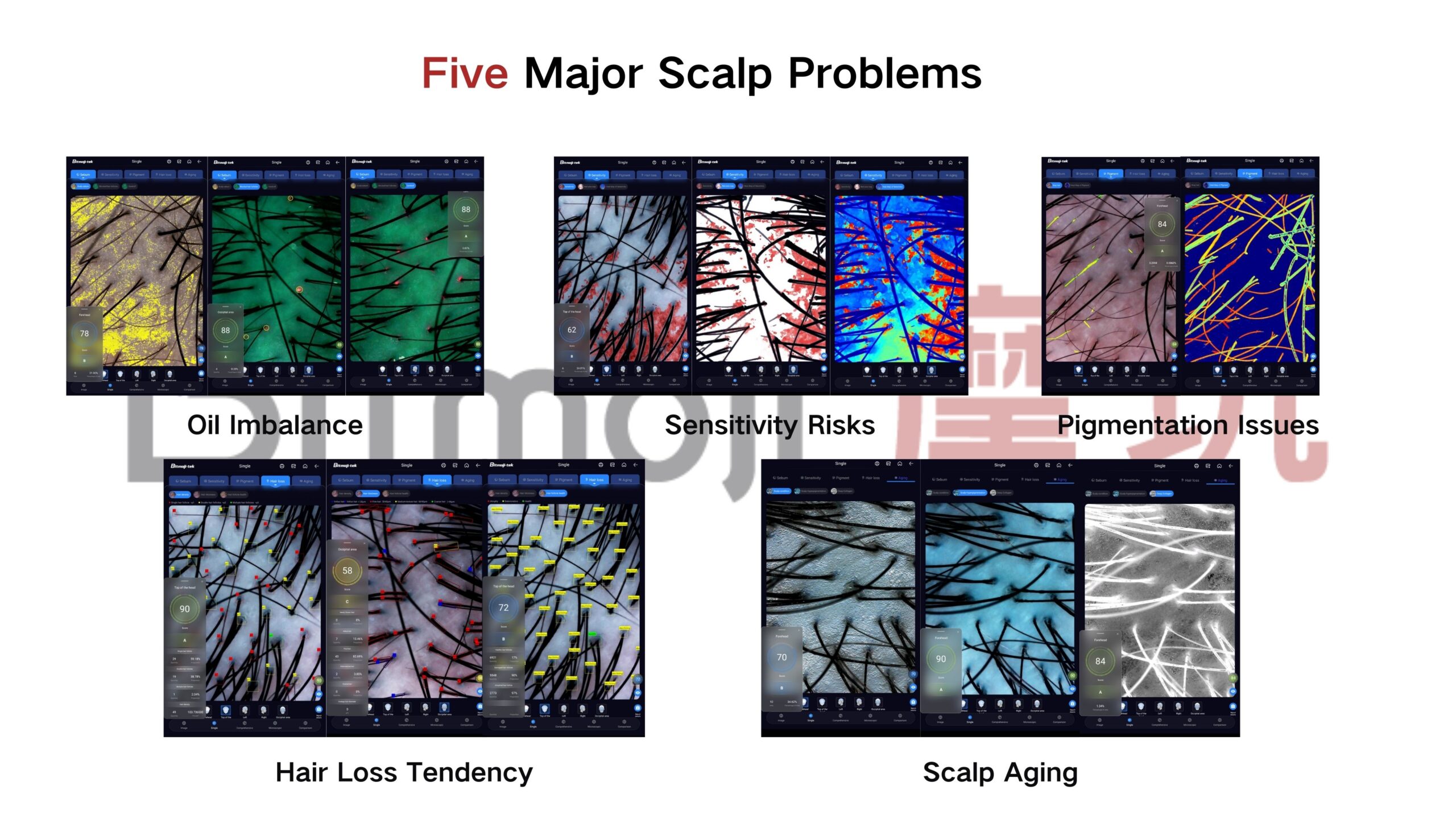 The Bitmoji T8 Scalp Analyzer excels in early detection, identifying five major scalp problems that often go unnoticed. These include oil imbalance, sensitivity risks, pigmentation issues, hair loss tendency, and scalp aging.