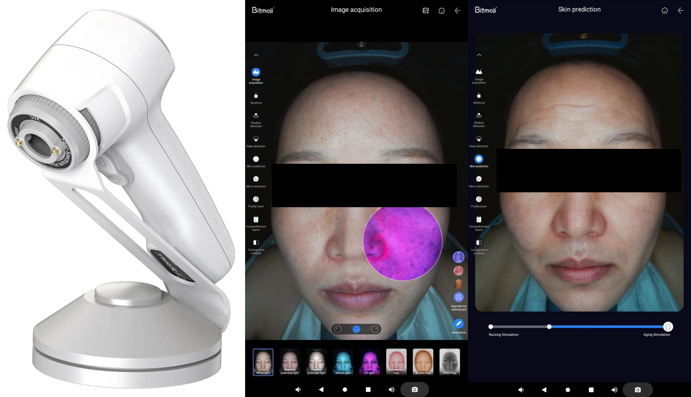 Multi-spectral Imaging Technology: This device uses four types of light—white, positive polarized, negative polarized, and UV light—to reveal different layers and uncover both surface conditions and deep issues like subcutaneous inflammation and collagen loss.