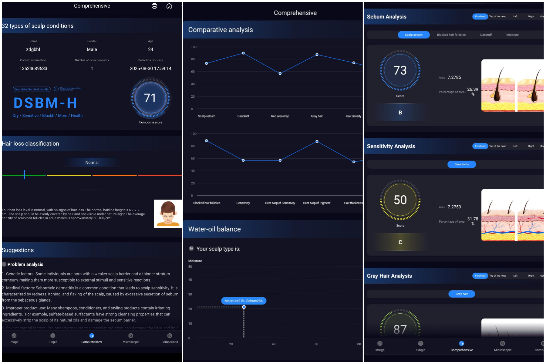 • Dynamic comparison: It compares your current data with results after proper care, allowing you to clearly see the level of aging on your scalp and any improvements made.