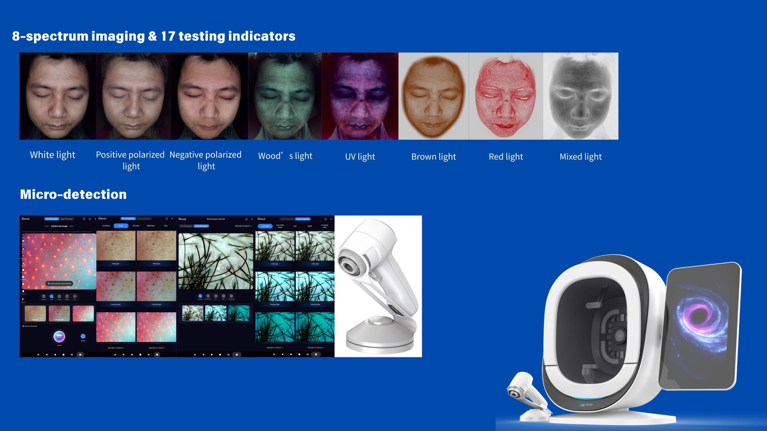 8-spectrum imaging & 17 testing indicators: It captures various microscopic features from the skin’s surface to deep layers, providing detailed and accurate skin analysis reports.